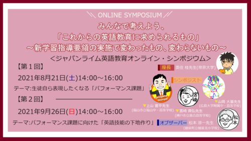 8月・9月におこなわれるジャパンライムさん主催のオンラインセミナーのご案内です。私も登壇させていただきます。 以前大修館『英語教育』の連載でご一緒した仲間と一緒に、新学習指導要領の実施により現場の授業がどう変わったのか(あるいは変わらずにいる…