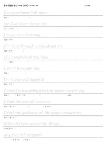 3年生はアンネの日記。間接疑問文がターゲットになっていたりして、重文・複文も増えてきて、文構造が複雑になっていることを実感できる英文です。 Lesson 7Dの意味順シート 特にLesson 7Cと7Dは、出来事を綴った日記というよりは、アンネの独白、思いを書…